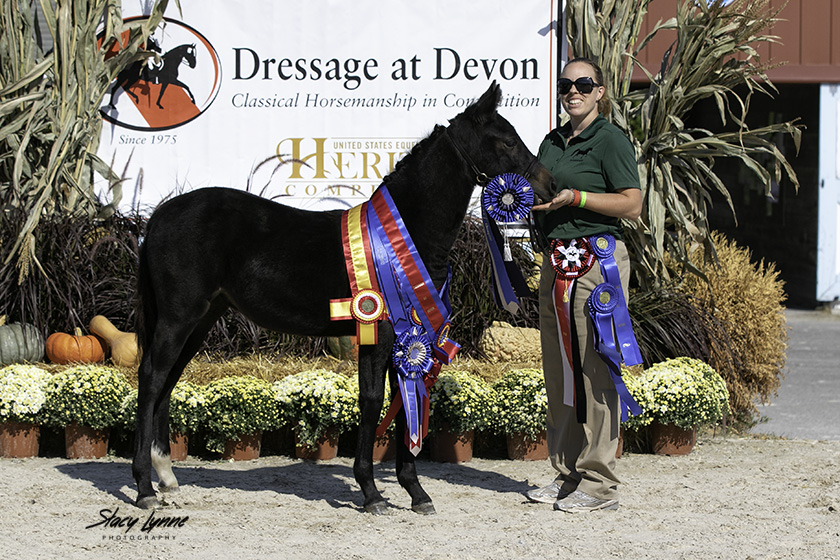 Five towering warmblood fillies, and one tiny Morgan pony, stood in the winner’s group, patiently waiting for the ribbons to be retrieved, and then for the final scores to be read as they took their turns posing with their beautiful fluttering prizes.